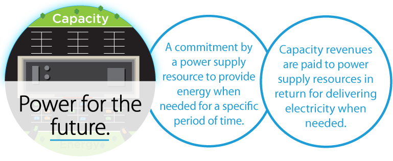Capacity represents a commitment of resources to deliver when needed, particularly in case of a grid emergency. A shopping mall, for example, builds enough parking spaces to be filled at its busiest time – Black Friday. The spaces are there when needed, but they may not be used all year round. Capacity, as it relates to electricity, means there are adequate resources on the grid to ensure that the demand for electricity can be met at all times.